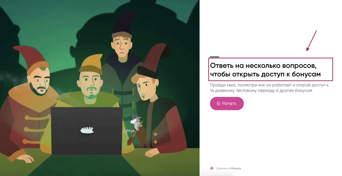 Подзаголовок должен дополнять заголовок, в нем можно разместить информацию о бонусах и скидках, например: “В конце вас ждет каталог со всеми нашими работами и бонус на первую покупку”. Тут работает важное правило: “Хороший заголовок показывает ценность от прохождения квиза, а хороший подзаголовок — дополнительные бонусы, не наоборот.”