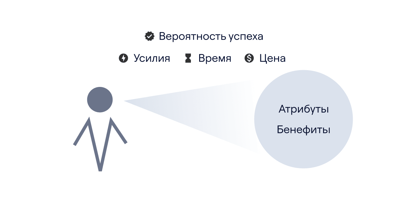Как я уже говорил, ценность живёт в восприятии покупателя. При рассмотрении вашего продукта в качестве решения своей проблемы покупатель учитывает четыре фактора: вероятность успеха, время, усилия и цену.