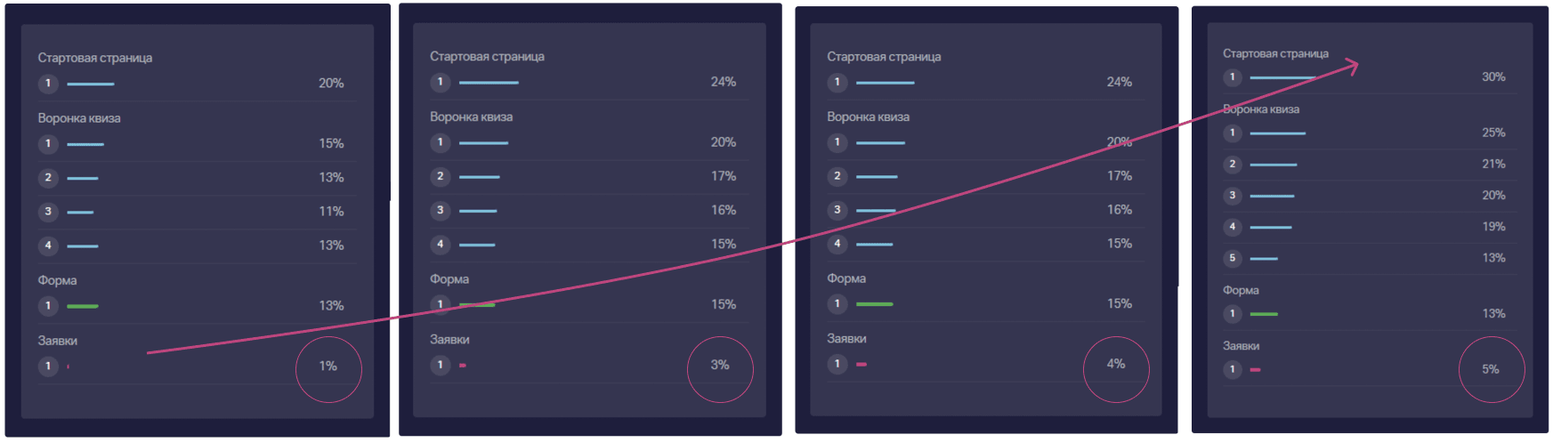 Если прорабатывать каждый экран квиза по воронке, то шаг за шагом можно добиться более высокой конверсии. Как в кейсе по недвижимости: маркетологи не забрасывали квиз из-за плохих результатов, а докручивали и докручивали, ориентируясь на данные внутренней аналитики.