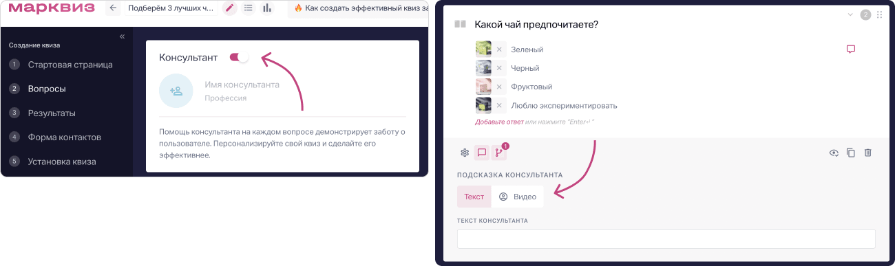 — текстовые и видеоподсказки консультанта — новый уровень квиза, когда вопросы сопровождает специалист.