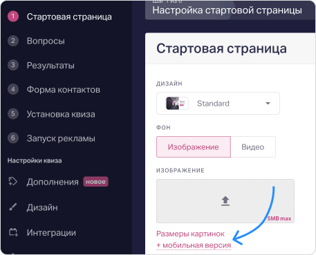Адаптировать под мобильный формат. Это вроде ерунда, но одна из главных причин, почему пользователи видят стартовую страницу квиза и не нажимают «Пройти». Если большинство посетителей заходят на квиз с телефона (можно узнать через счётчик Яндекс Метрики), логично было бы посмотреть, какой формат картинки выигрышно смотрится с мобильного экрана.