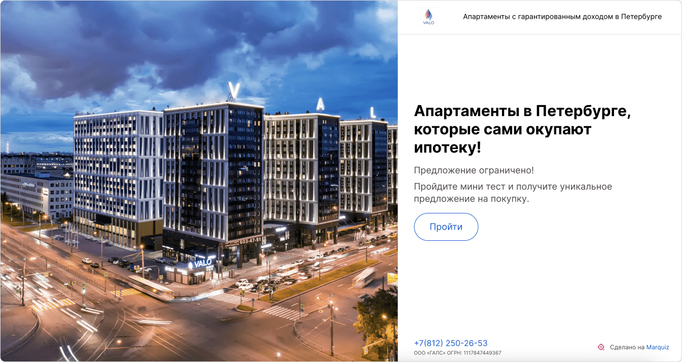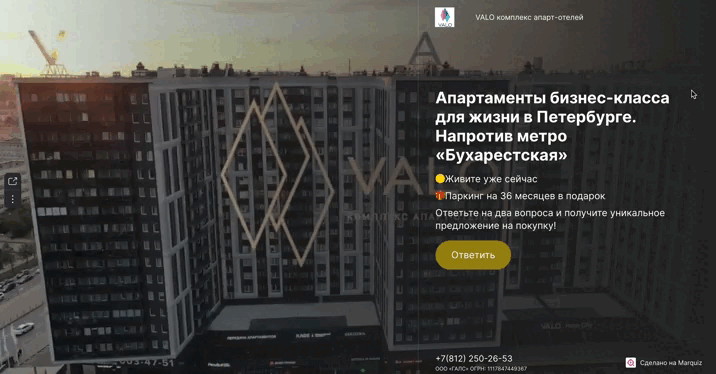 Если использовать вместо стартовой страницы Marquiz Pages, будет проще рассказать и показать важное, прогреть клиента и потом уже направить на квиз.