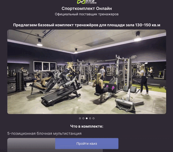 Например, быстрая страница Marquiz Pages об ассортименте компании по продаже тренажёров. Сначала короткая презентация — потом квиз.