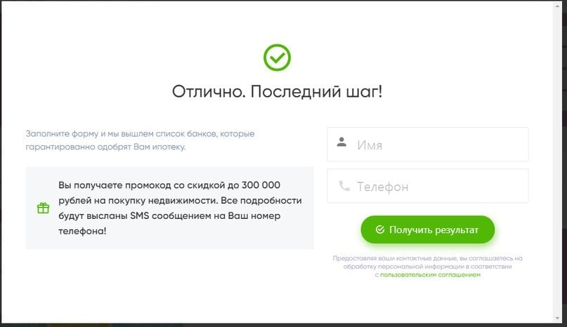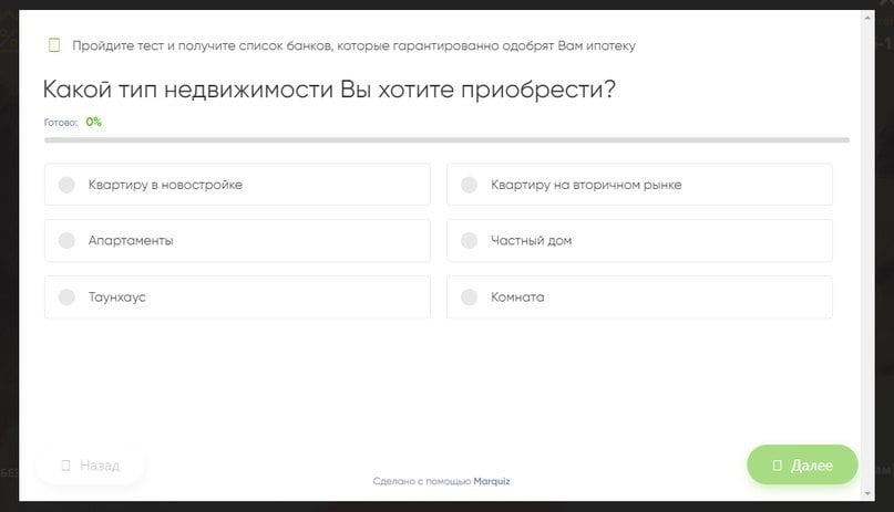 Действовали по такой же схеме, как в этом кейсе: создали посадочную страницу на конструкторе с применением сервиса Marquiz, сформировали УТП, составили 7 уникальных вопросов. В качестве бонуса за заполнение контактов после прохождение опроса предложили скидку на покупку квартиры.