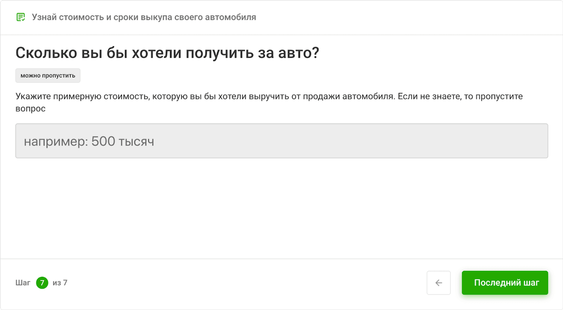В квиз добавили 8 вопросов про авто клиента, которые могут подтолкнуть к тому, чтобы оставить заявку. Вот один из них: