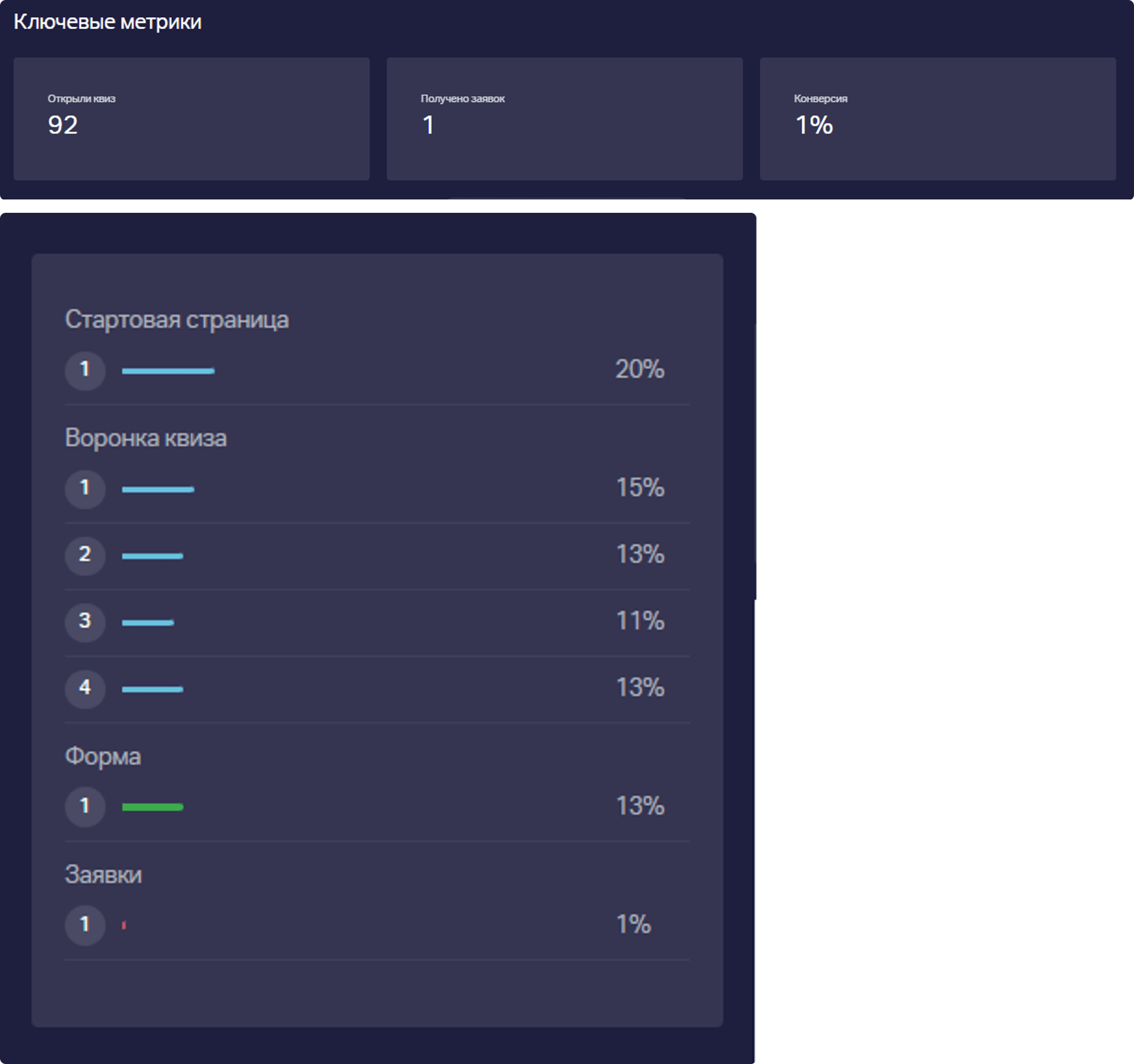 Не нужен космолёт, чтобы конкурировать с Яндекс Метрикой. Подробная и наглядная воронка по каждому экрану квиза, лаконичная статистика открытий и заявок.
