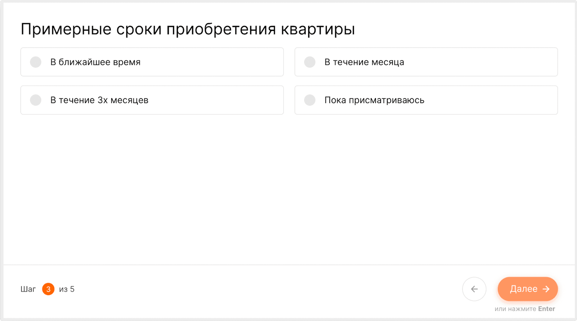 - Добавили вопросы о сроках приобретения квартиры, чтобы помочь отделу продаж эффективно распределить приоритеты по обработке заявок: