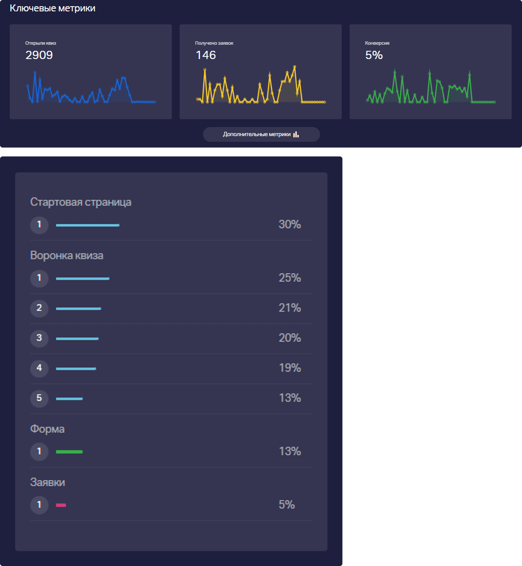 - 2909 открытий квиза из них 146 заявок — конверсия 5%.