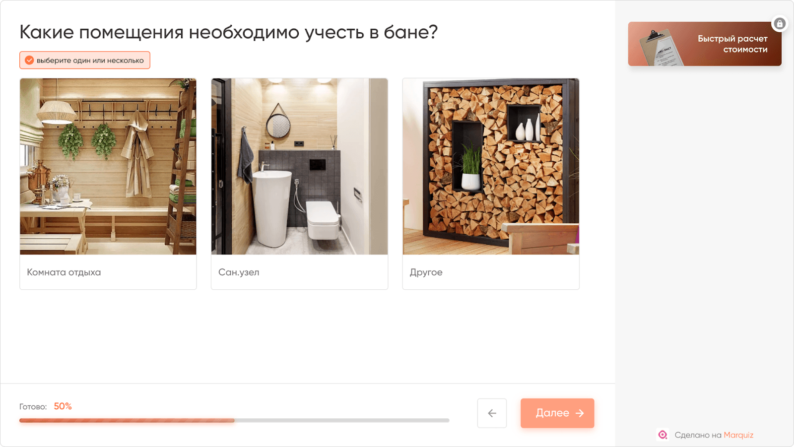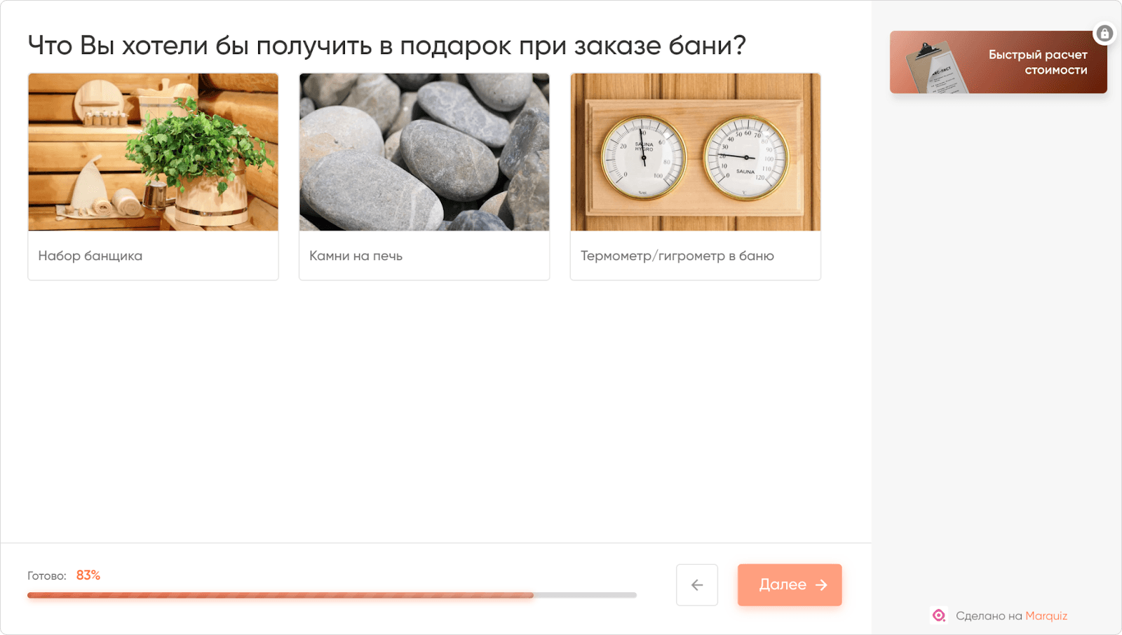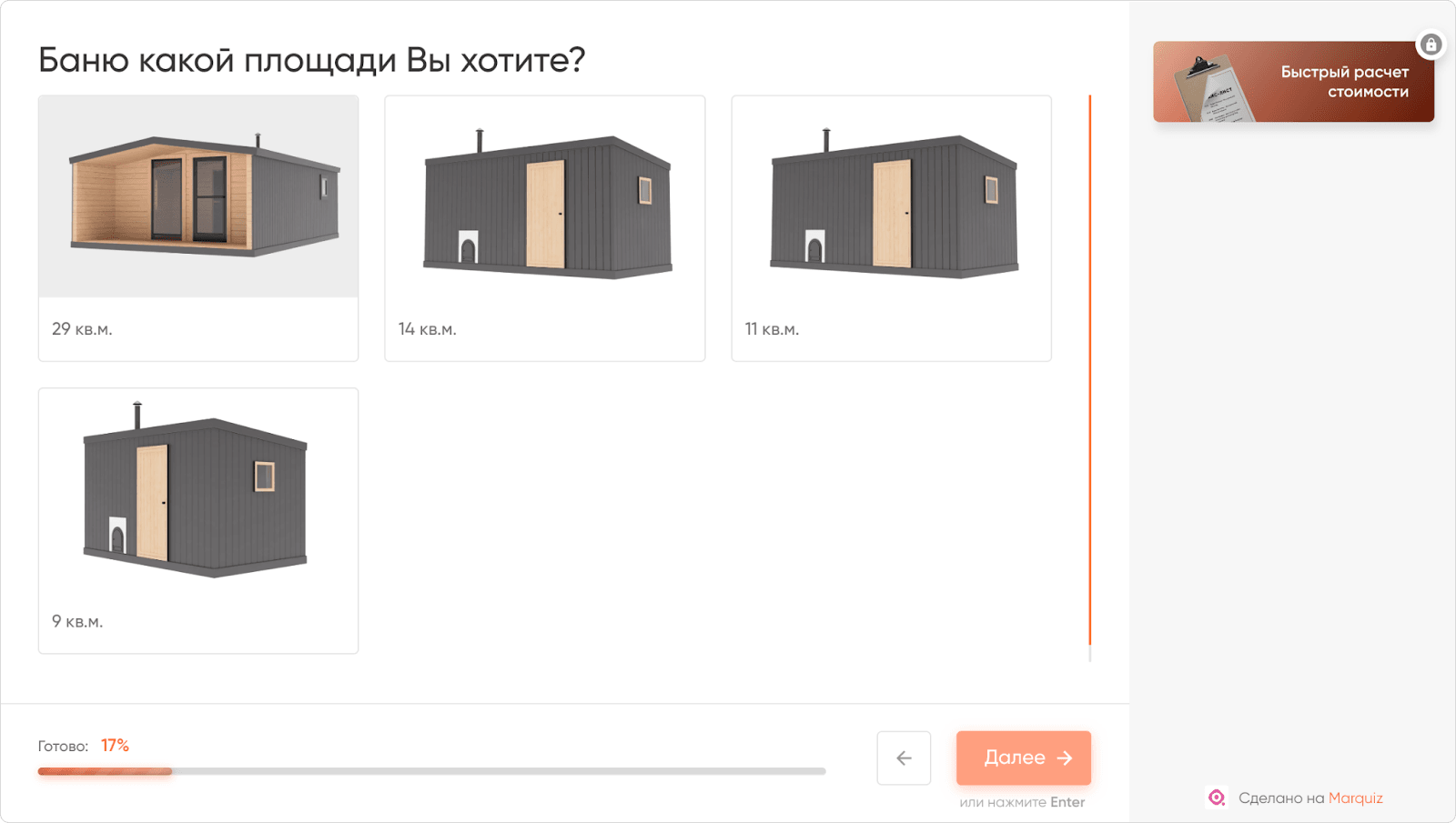 Факт №2: Начали с эконом-варианта, а вышли с помощью квиза на продажу бани из премиум-сегмента на 1+ млн рублей.