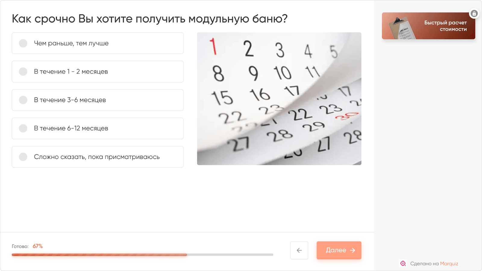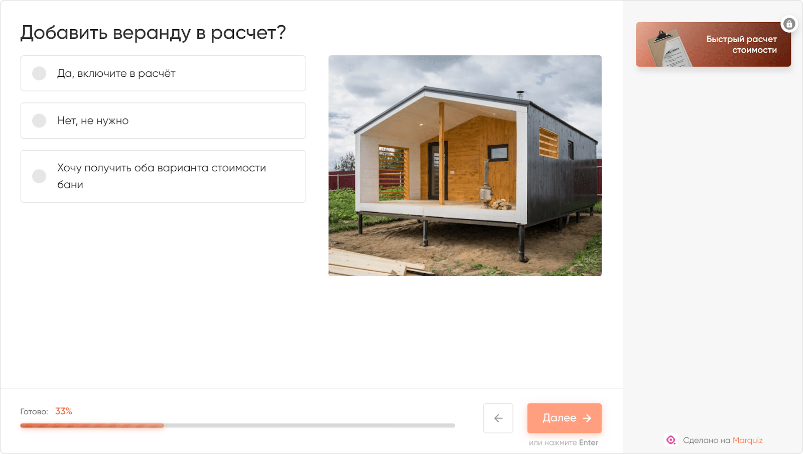 ✅ Составила квиз только из простых, базовых вопросов. Шаг за шагом квиз комплектует заявку: площадь, добавить ли веранду, планировка, доп. опции и срочность заказа.