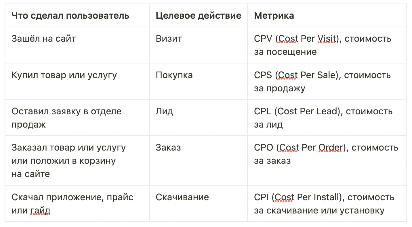 Так появляется базовое понятие метрики СРА — целевое действие. Посмотрим, какие они бывают.