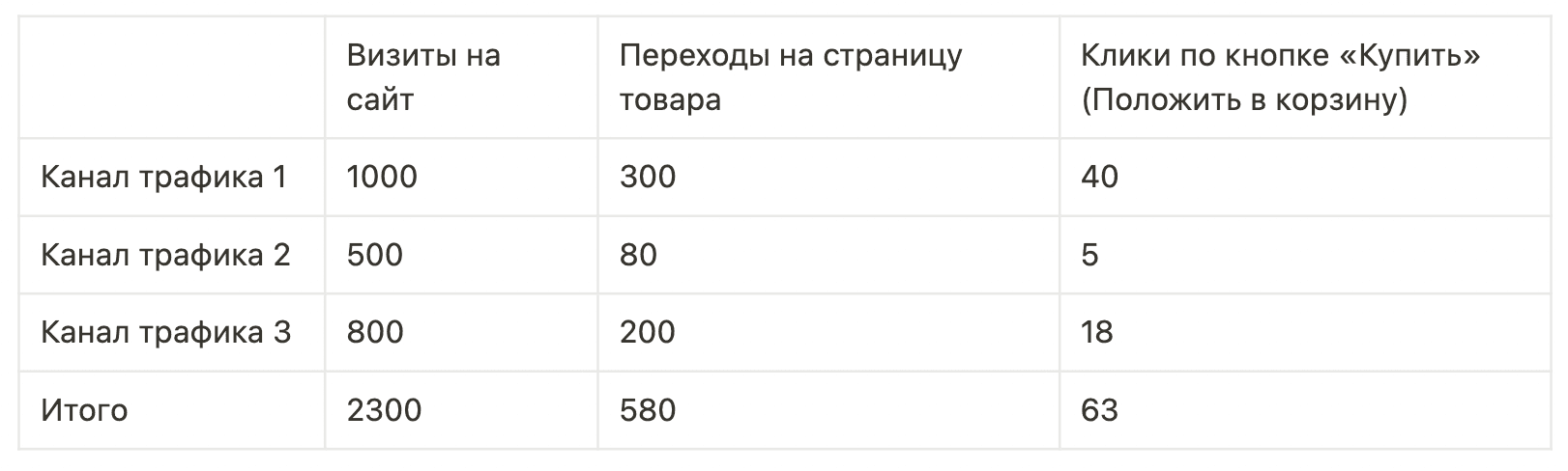 Предварительный вывод: по СРА-модели стоимость СРО выше ожидаемой, нужно оптимизировать воронку продаж и убирать каналы трафика с наименьшим количеством целевых действий. Обычно по одной неделе выводов не делают, лучше смотреть в динамике, но если «Канал трафика 2» снова покажет маленький выхлоп, от него будет лучше отказаться.