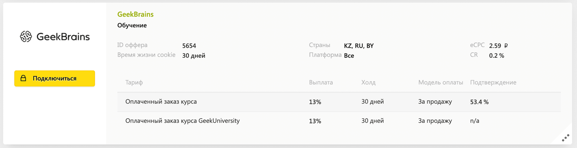 Например, компания GeekBrains размещает в СРА-сети Advertise.ru оффер, что за каждый оплаченный заказ курса компания готова заплатить 13% веб-мастеру.