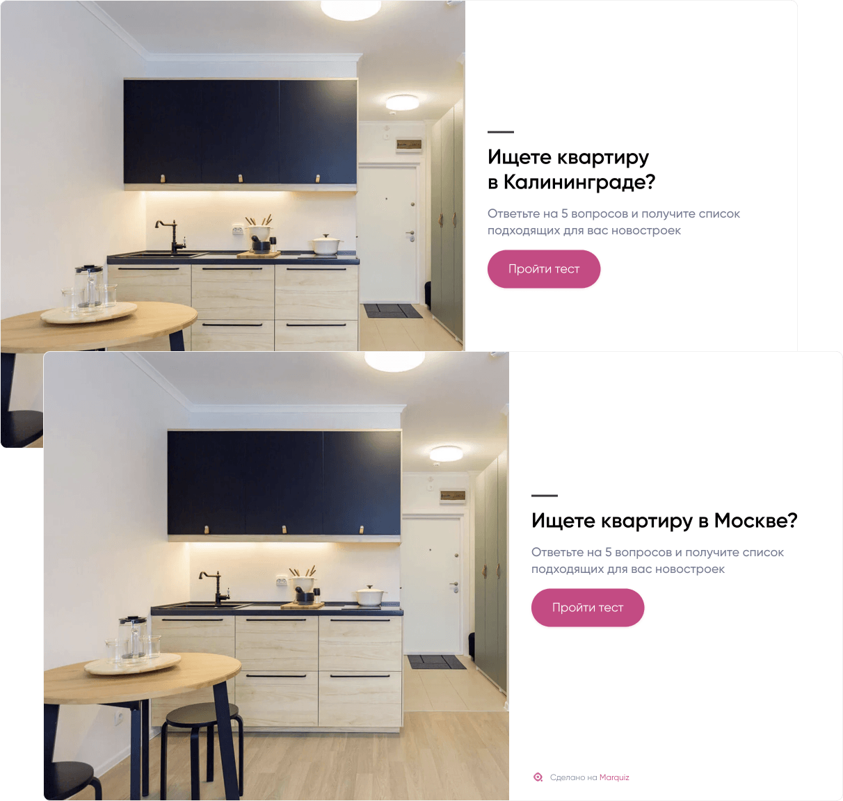 Так, в квизе можно настроить несколько офферов для разных аудиторий, например по геолокации, тексту, главным характеристикам.
