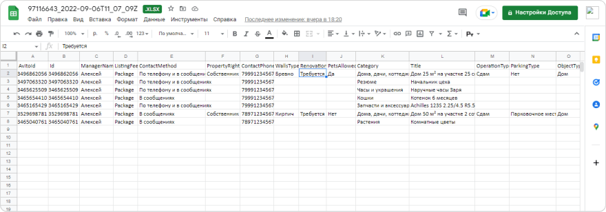 *Таблица excel с уже опубликованными объявлениями должна выглядеть так. Источник: *Авито