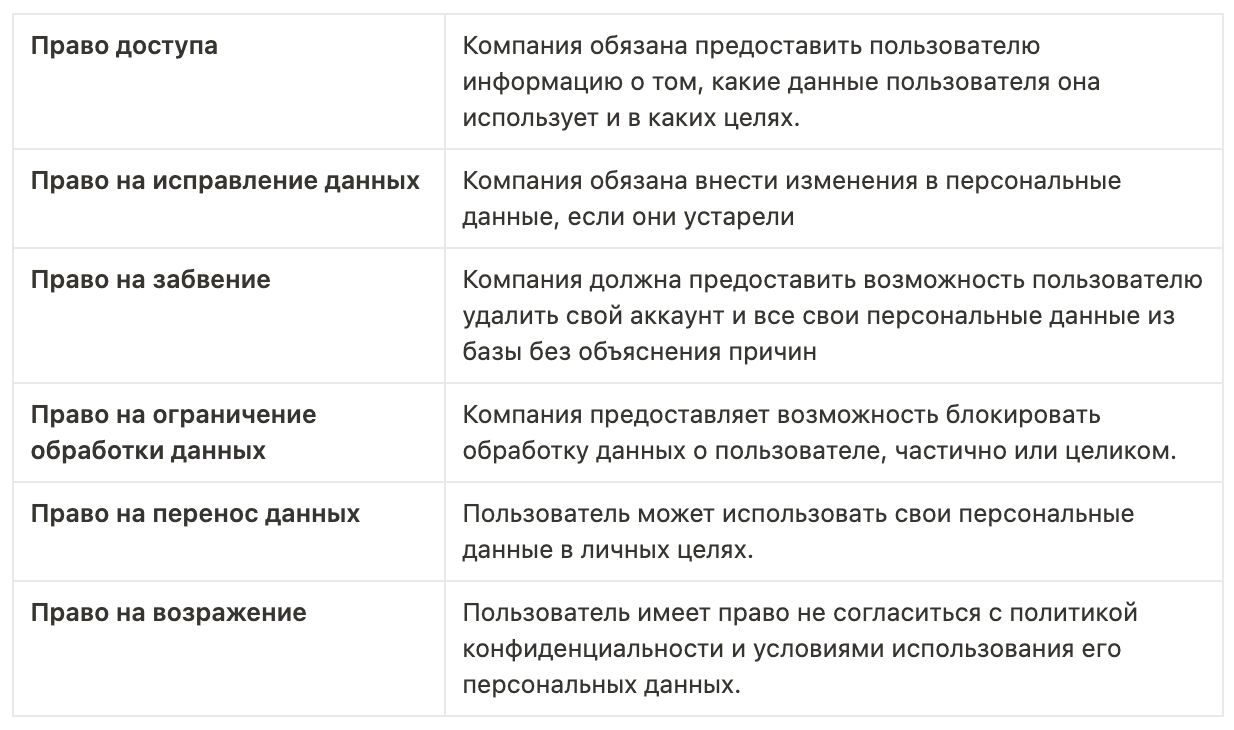 Регламент GDPR даёт пользователям, то есть субъектам данных, достаточно широкий набор прав. В частности 15, 16, 17, 18, 19, 20, 21, 22 статьи GDPR гарантируют: