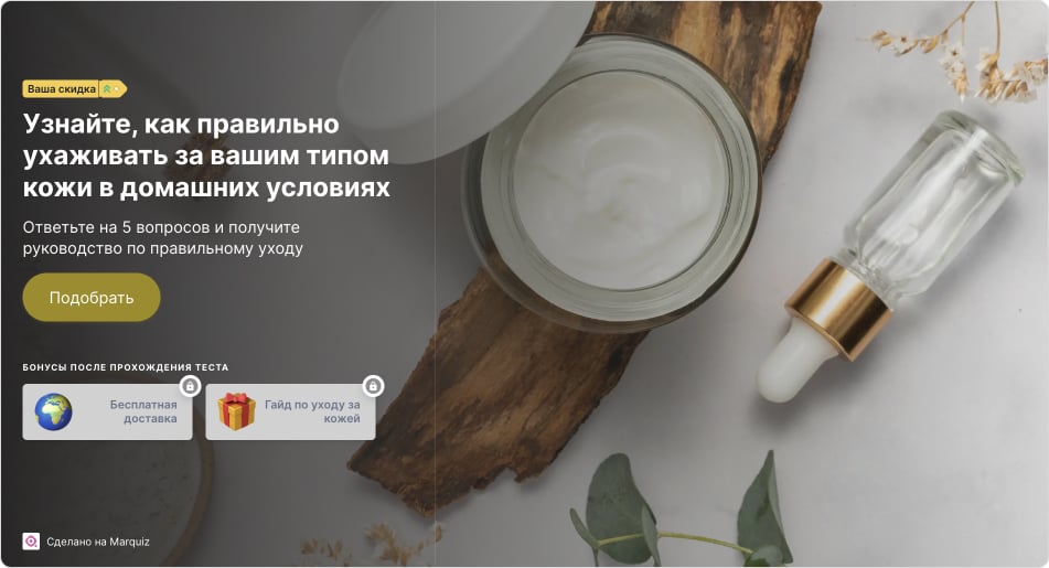 Какой косметический уход рекомендовать клиенткам? Чтобы узнать, какие проблемы они хотят решить, можно предложить квиз и персональную подборку косметики. Готовый шаблон есть в Галерее