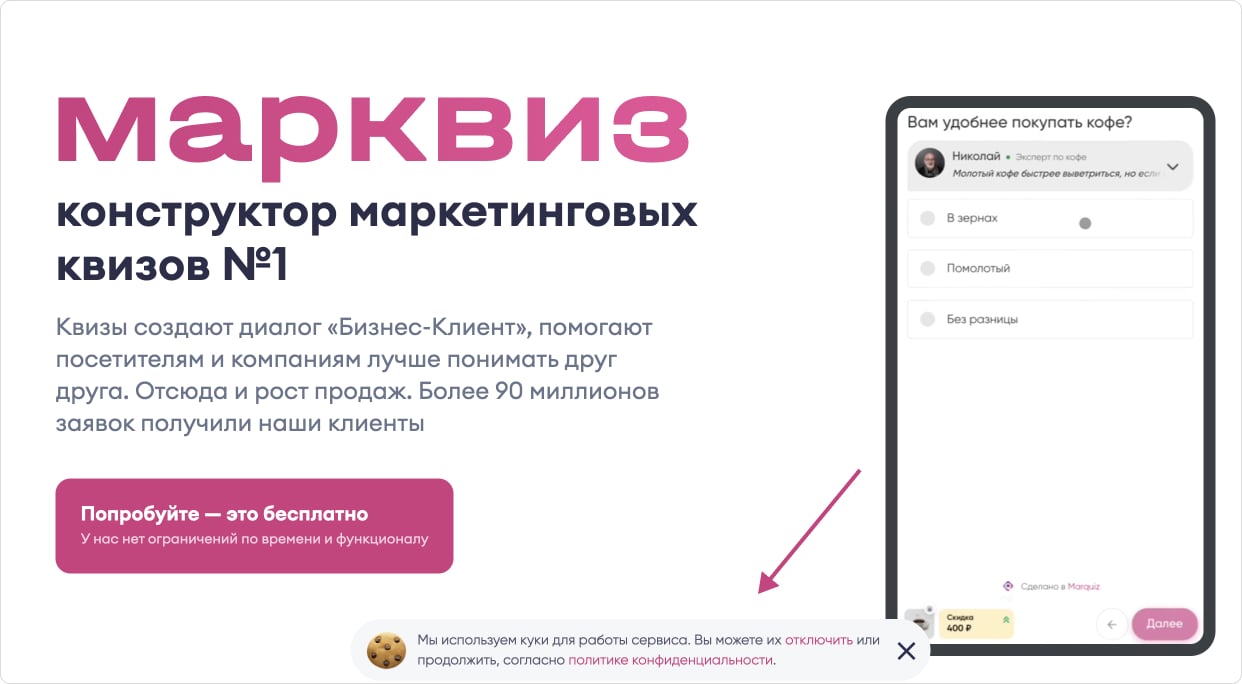 Соглашение на использование куки появляется в виде всплывающего окна на главной странице Марквиз