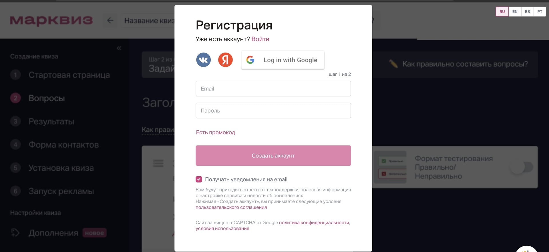 При повторном входе в конструктор Марквиз система подставит почту и пароль автоматически