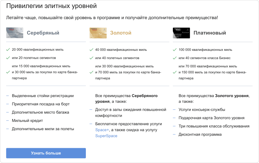 Другая механика геймификации в программе лояльности — это изменение статуса и уровни. Так, например, в зависимости от статуса клиента, авиакомпания «Аэрофлот» предлагает разные уровни привилегий.
