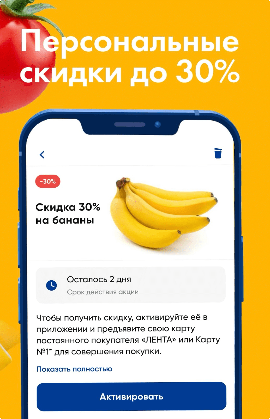 Разберём пример — карту постоянного покупателя из магазина Лента. Её использование снижает цены на отдельные группы товаров: в данном случае скидка действует на бананы. Каждые две недели выбор продуктов по акции обновляется, и покупатели активируют скидки только на релевантные для них товары.