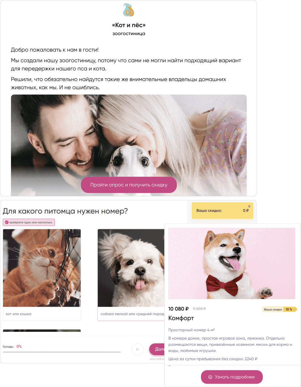 Универсальный вариант для любого бизнеса — создать квиз-лендинг. Сначала на нём мы презентуем бренд аудитории: рассказываем о себе, перечисляем преимущества и особенности нашей работы. Потом — предлагаем пройти опрос и получить скидку. Квиз-лендинг работает как посадочная страница, приносит заявки и собирает портрет целевой аудитории. Вот как квиз-лендинг может выглядеть на примере зоогостиницы:
