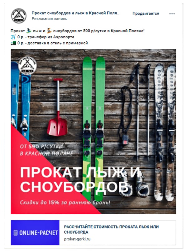 *Один из вариантов баннера для целевой рекламы ВК из нашего кейса, *как получить более 4000 заявок на прокат горнолыжного снаряжения в Красной Поляне