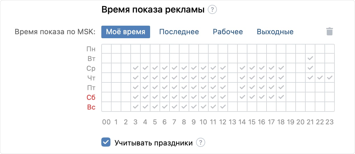 Нужен для настройки показов объявлений в выбранное время. Это в первую очередь актуально для кафе, ресторанов и доставки еды, которые рекламируются ближе к обеду, обязательно накануне вечера пятницы и так далее.