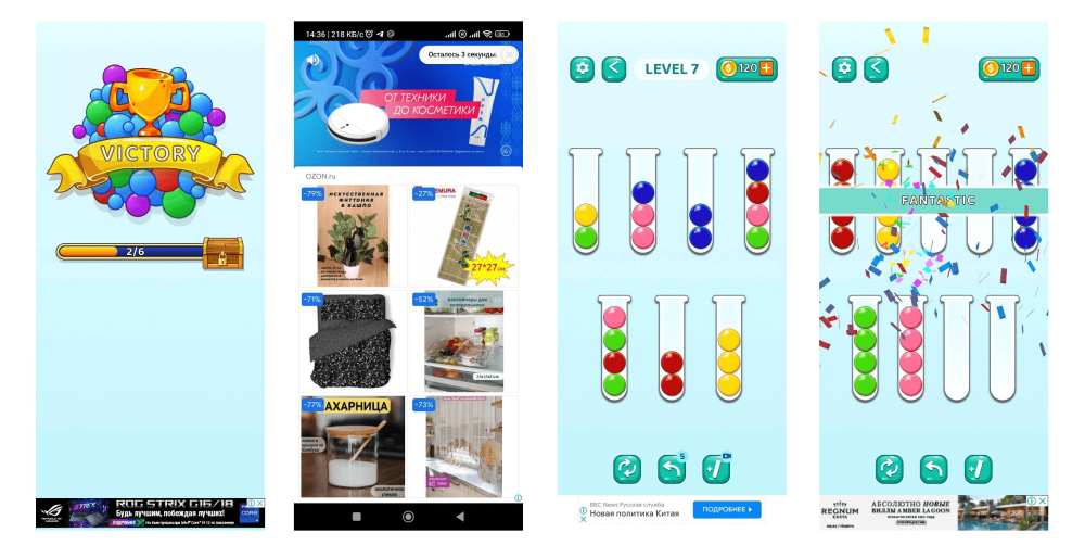 Таргетированная реклама на каждом уровне игры в мобильном приложении: внизу экрана и на весь экран