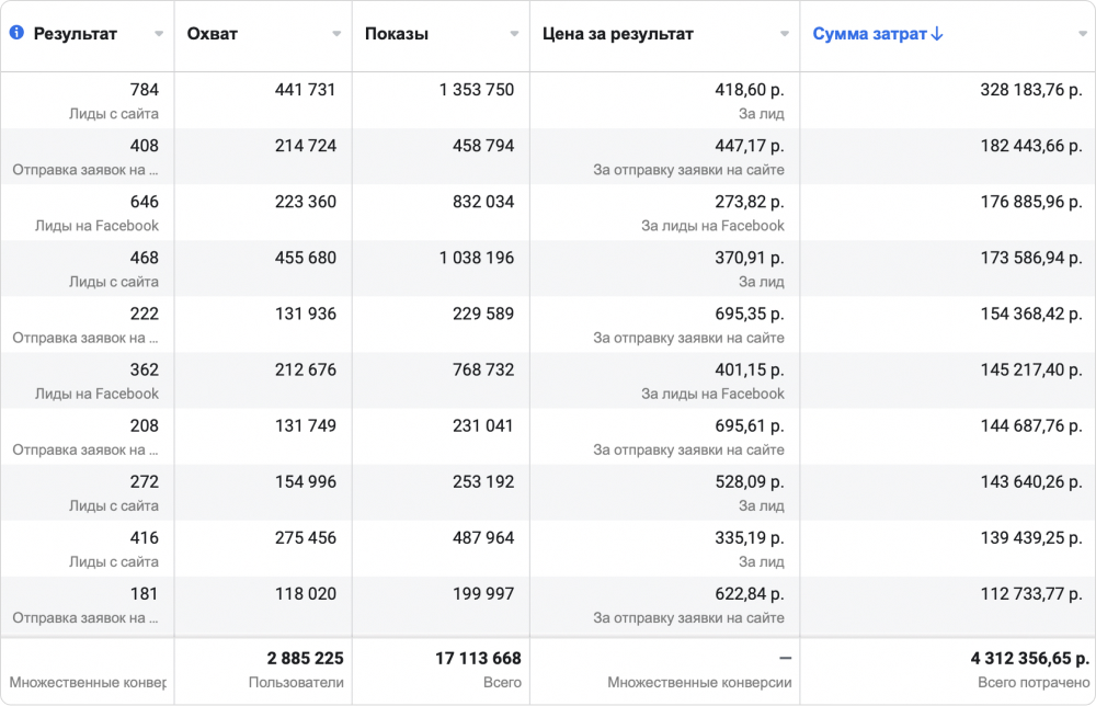 Каналы, которые приносят меньше всего лидов, работают не эффективно. ФБ — сеть запрещённая в РФ