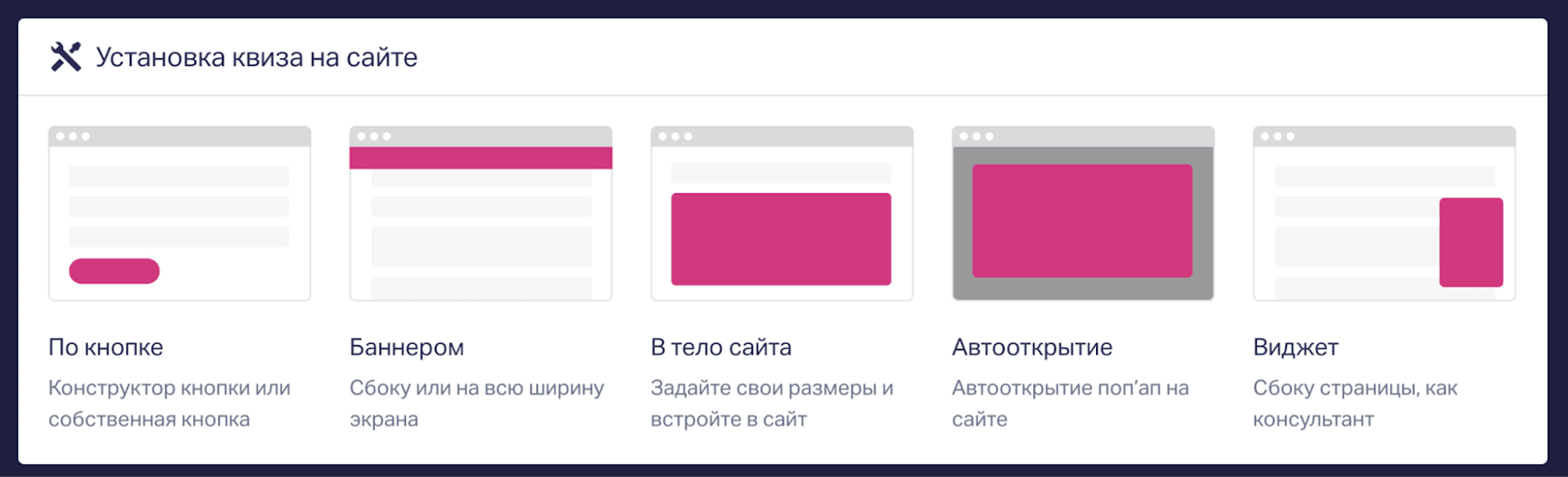 Квиз может быть по-разному установлен на сайт и выполнять функции разных виджетов:
