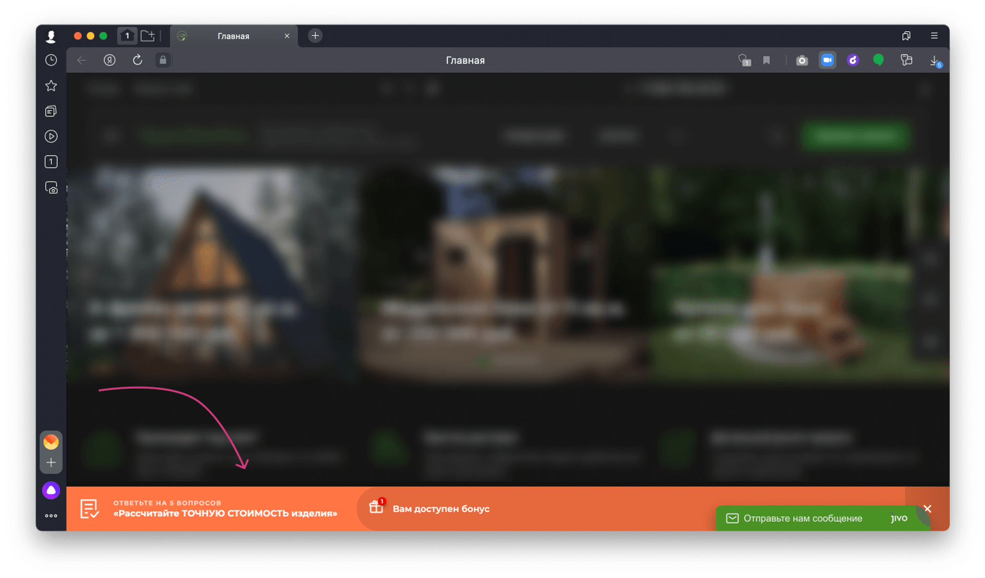 Виджет в виде баннера с квизом на главной странице сайта услуг по строительству домов