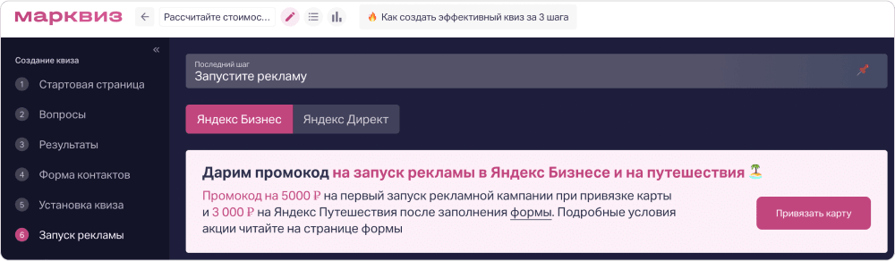 💡 Для пользователей Марквиз Яндекс Бизнес дарит промокод на 5000₽. Чтобы воспользоваться, переходите в панель