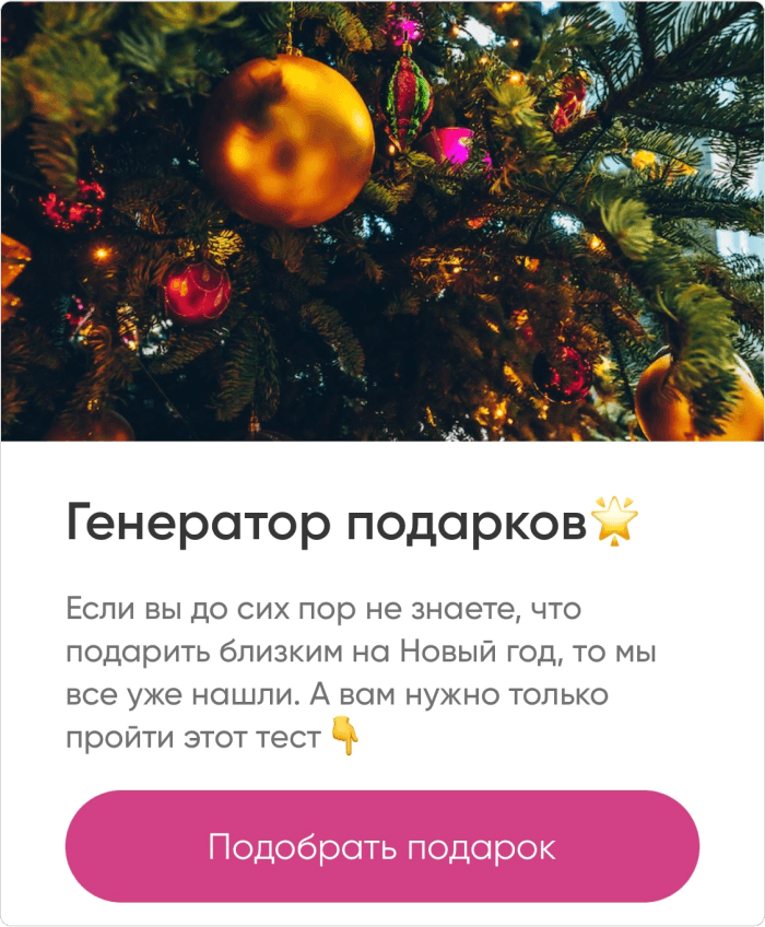 Квиз из галереи шаблонов. Как правило, маркетинговые квизы значительно улучшают эффект от Cost Per Mille, поскольку привлекают внимание своим форматом и стимулируют клики