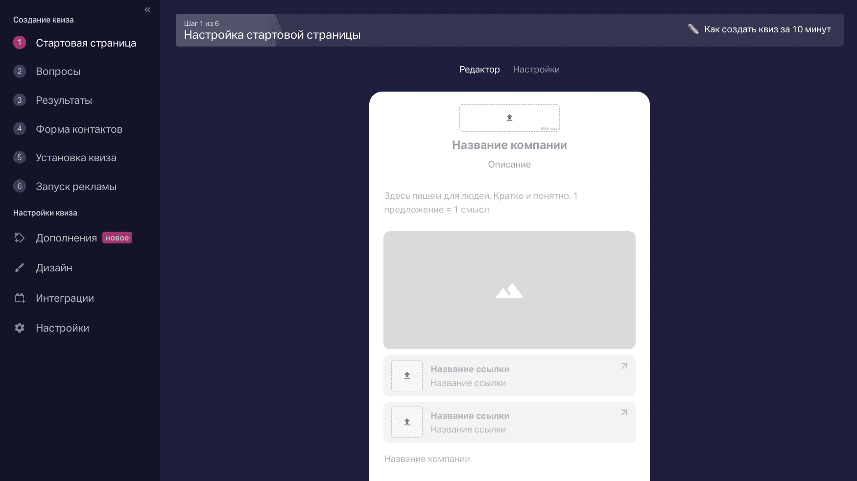 Если вы выбрали вместо стартовой страницы Marquiz Pages, то блок с кастомизированными ссылками уже красуется по умолчанию в редакторе Мarquiz Pages: