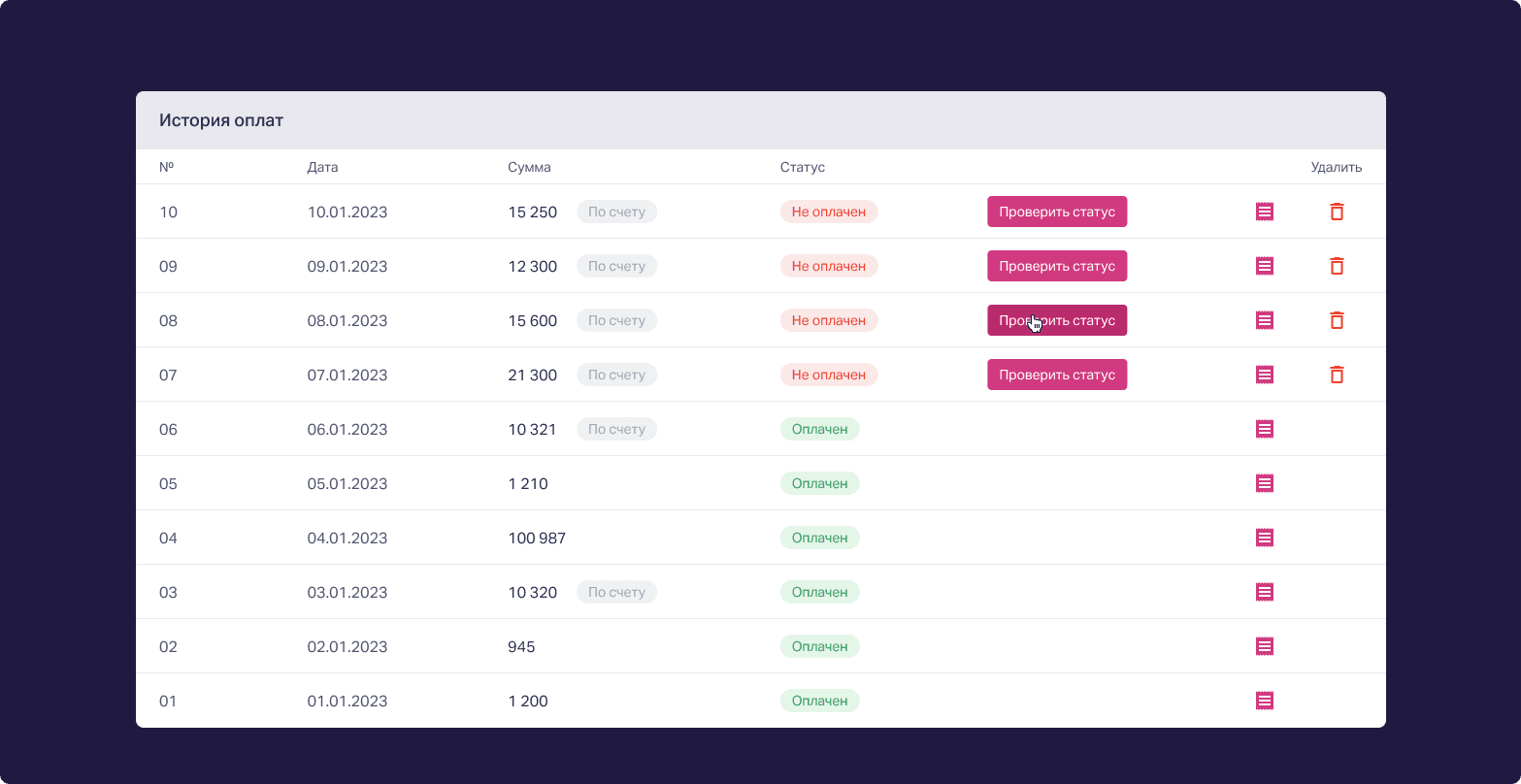 Проверка оплаты по счёту и обновление истории оплат