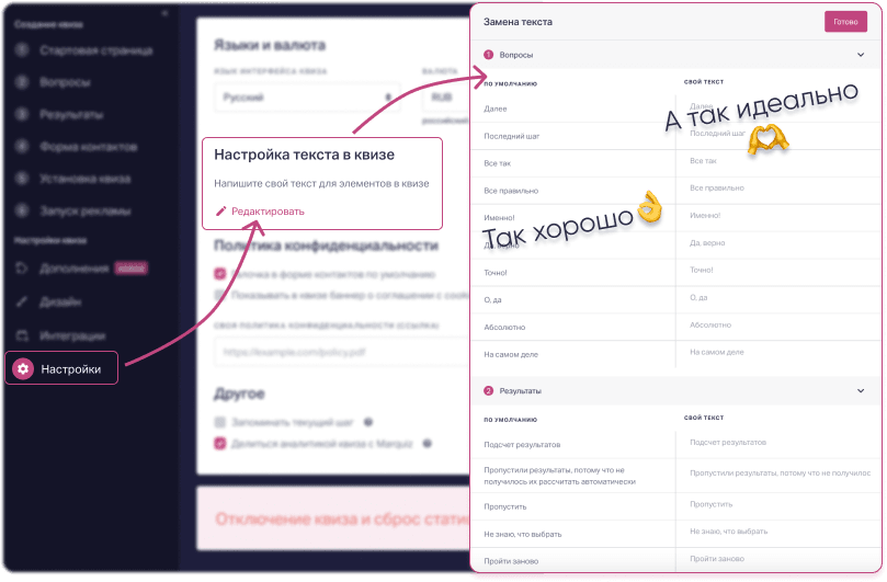 - Нажать «Редактировать» в разделе «Настройка текста в квизе».