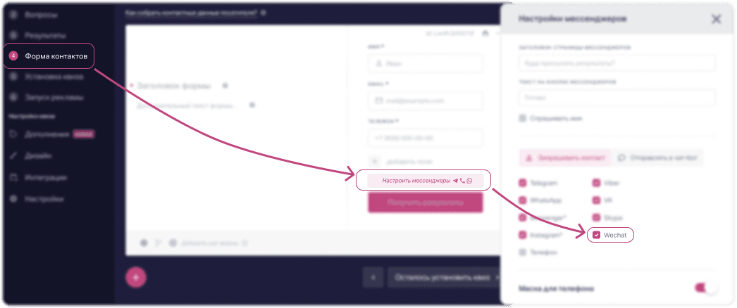 🤓 Бывает, что не хватает только одного шага, чтобы встретиться со своей аудиторией. Поэтому мы добавили Wechat в мессенджеры на форме контактов, чтобы наши клиенты смогли дотянуться квизом до покупателей из Китая.
