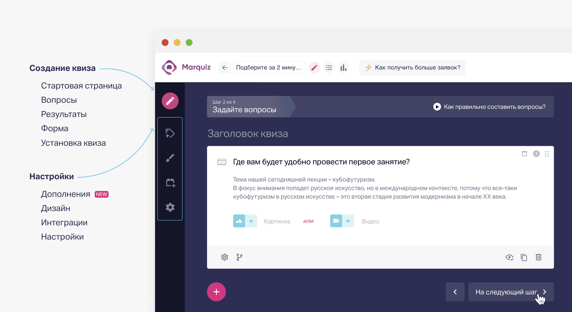 - Рекомендуемые размеры картинок сможете найти на стартовой странице, перейдя по ссылке. Там же найдете небольшие рекомендации по использованию картинок от наших дизайнеров. Если не терпится посмотреть - статья по ссылке https://help.marquiz.ru/article/1953