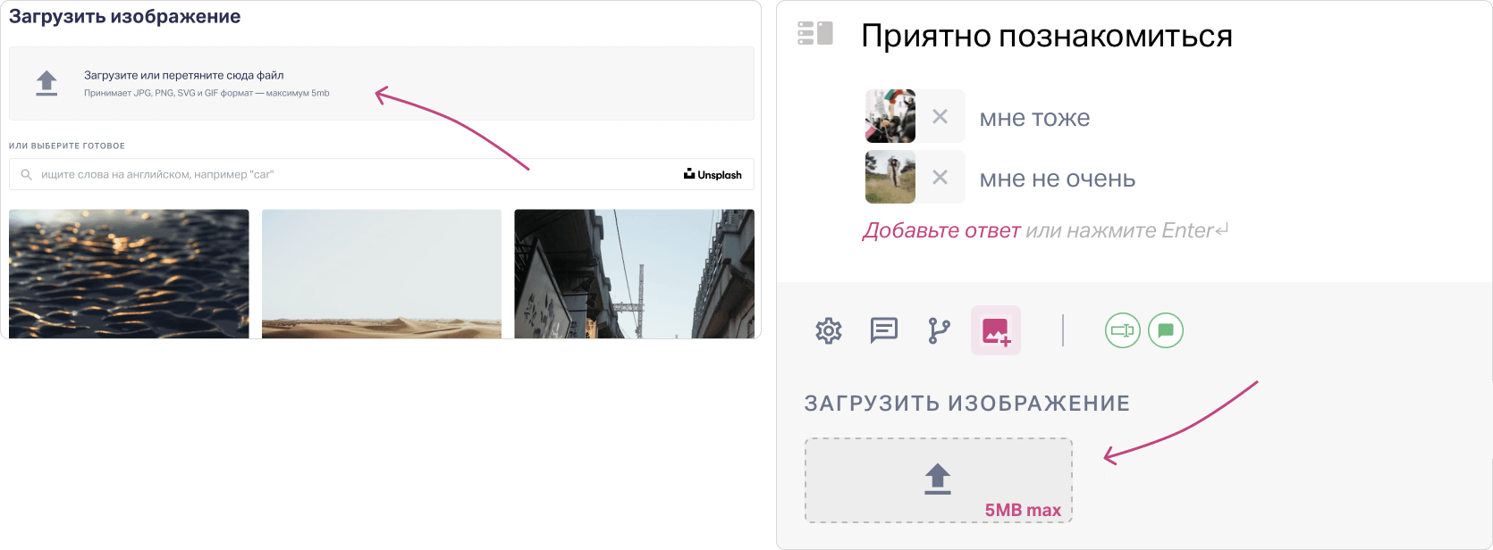 🧊 Если нужная картинка под рукой, то можно добавить в квиз без перехода в поиск по компьютеру. Сразу перетягиваем картинку на нужную плашку, и она сама загрузится в квиз.