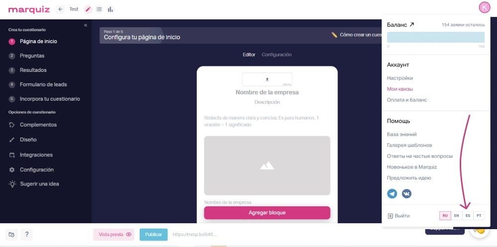 Hola! Международное подразделение Marquiz выходит на испанский, португальский рынок и рынок Латинской Америки. Полностью перевели всю рабочую панель на испанский.