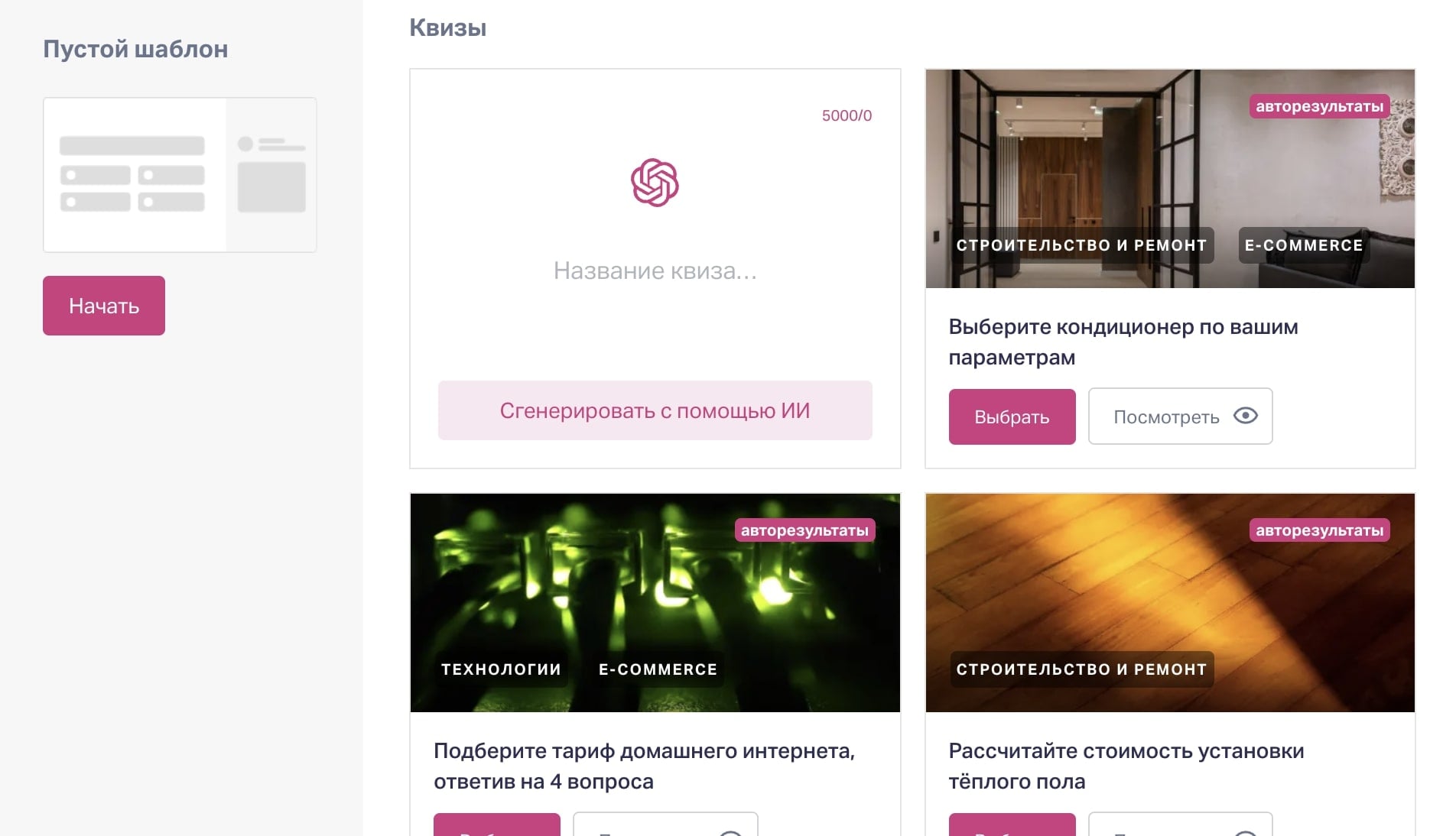 Теперь квизы можно делать за минуту с помощью искусственного интеллекта. Нажимаете «Сгенерировать с помощью ИИ» и получаете готовую структуру квиза с вопросами и ответами под вашу нишу.