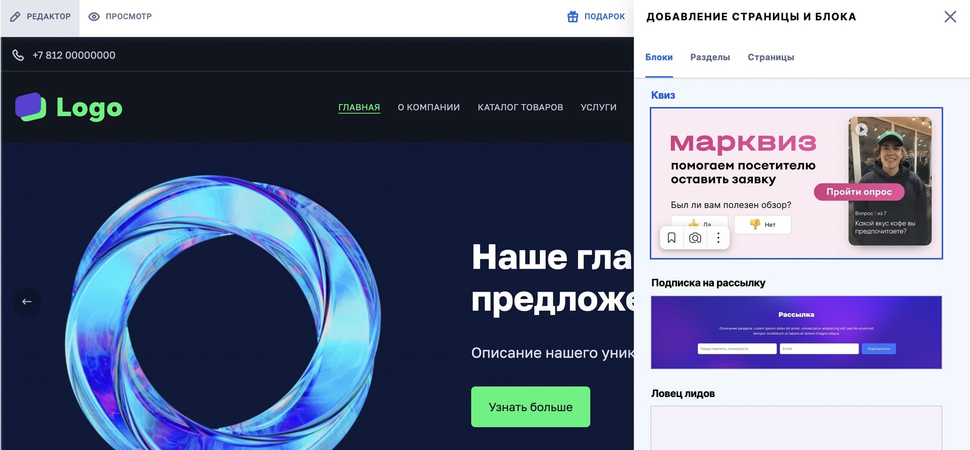 - Заходите в конструктор сайтов NetHouse и выбираете блок «Квиз».