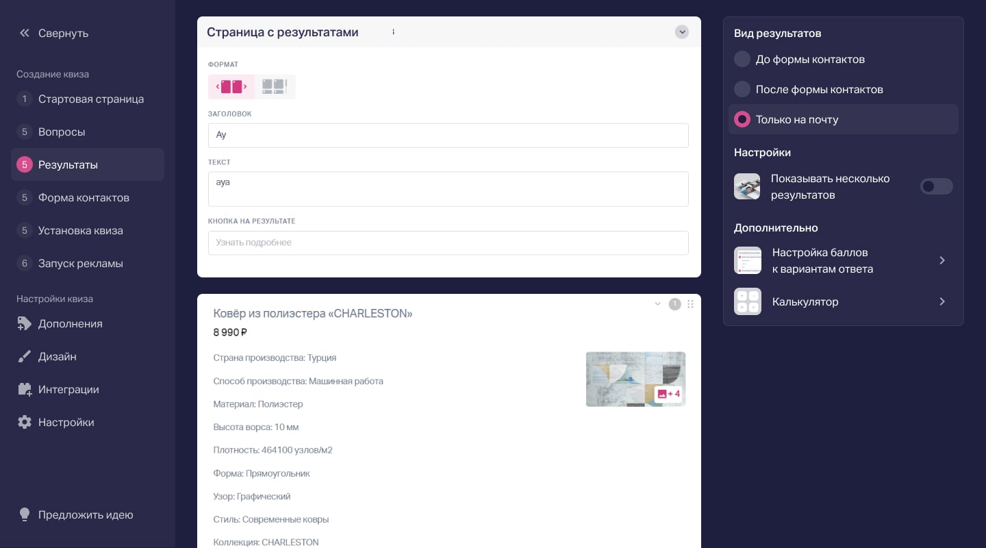 Вы можете сами решать, отправлять результаты клиенту на почту или только показать в квизе. Больше гибкости для высокой конверсии