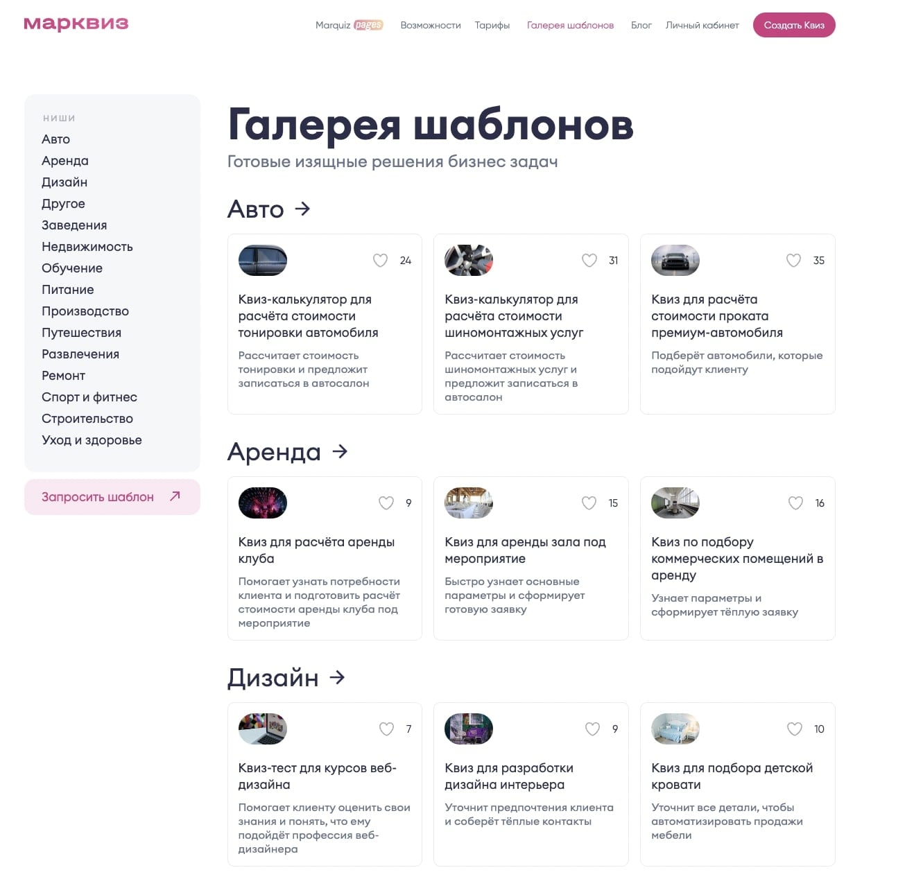 Обновилась галерея шаблонов, теперь у нас 114 готовых квизов, в том числе есть и с лендингом Marquiz Pages.