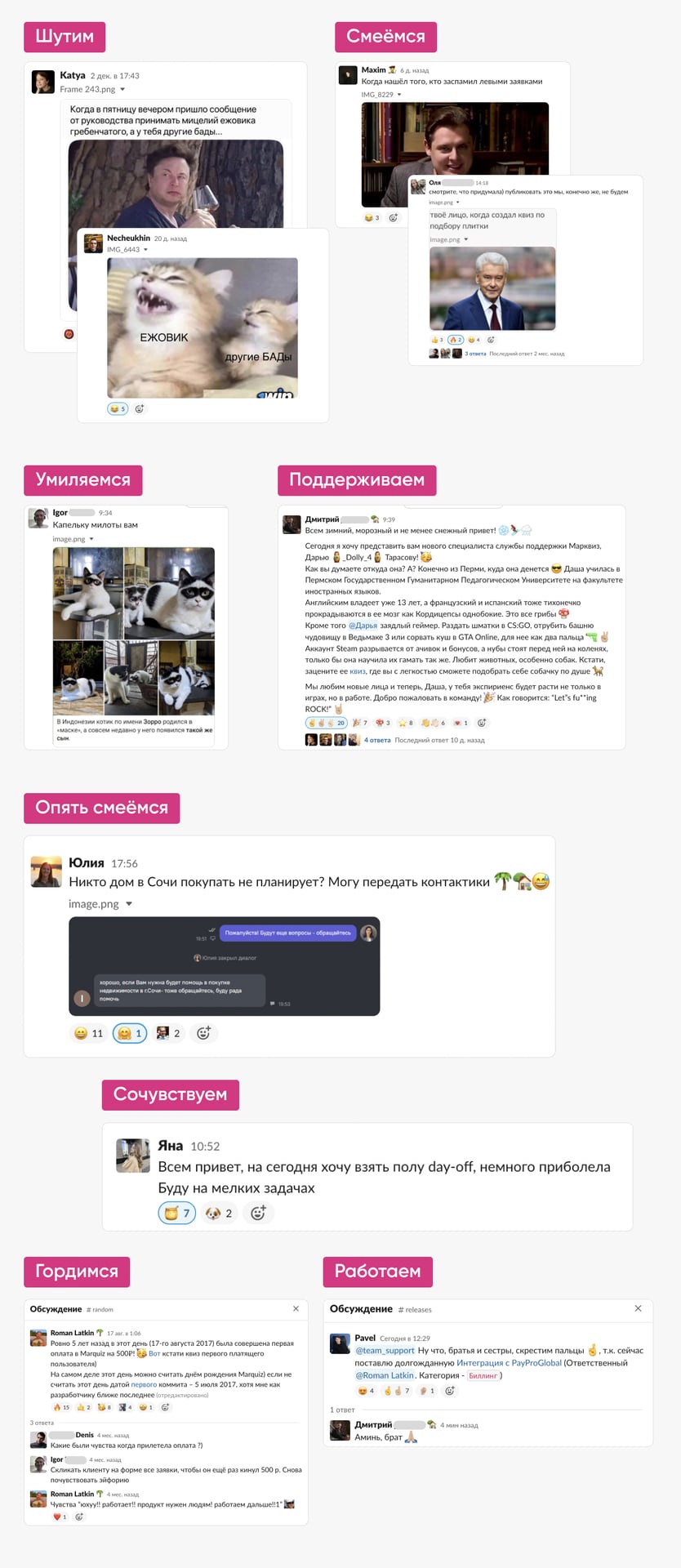 Slack. И на десерт 🧁 — наша внутренняя переписка. В Слаке удобно общаться, перезваниваться, формировать свои группы по проектам и по кругам. Все инструменты под рукой, до любого человека в компании можно достучаться. Слак — это наше пространство рабочего и неформального общения. Здесь мы шутим, смеёмся, умиляемся, поддерживаем друг друга, гордимся достижениями, ну и работаем💪🏻.