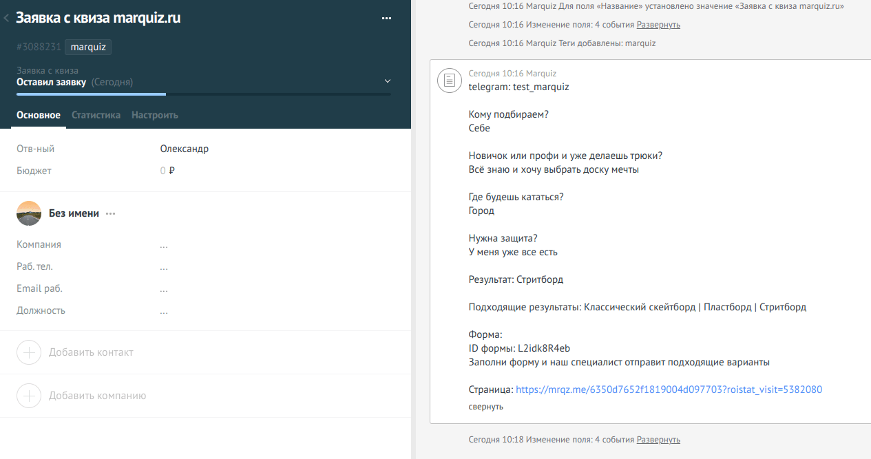 🤩 Сейчас можно настроить, что нужно раскидать из заявки в разные поля. В систему передаются отдельно ответы на вопросы, результаты и данные контактов, чтобы удобнее было автоматизировать всякие штуки в AmoCRM и Bitrix24: