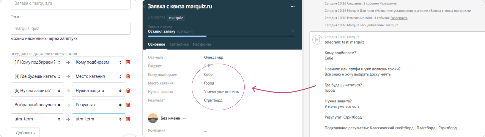 Тут есть один нюанс: интеграция с этими системами была и раньше, но стыковка была незаботливая. Результаты квиза передавались в систему в виде примечания в карточку сделки, и менеджеру приходилось руками разносить эту информацию по полям карточки. А хочется же, чтобы сразу можно было настроить и не делать лишнюю работу.