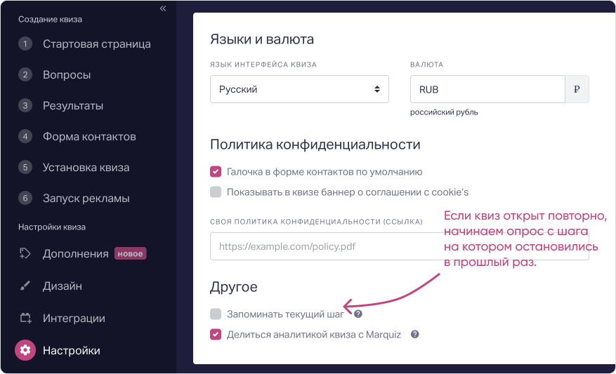 Запоминание шага в квизе
