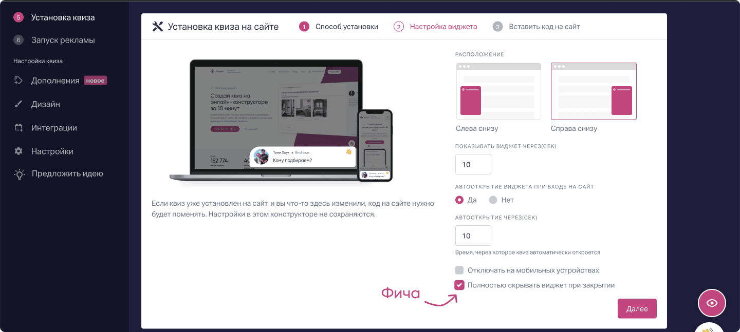 Раньше когда клиенты устанавливали квиз в формате виджета на сайт, то он неотступно сопровождал посетителя, снова и снова разворачивался и напоминал о себе. Кому-то было норм, кому-то — нет.